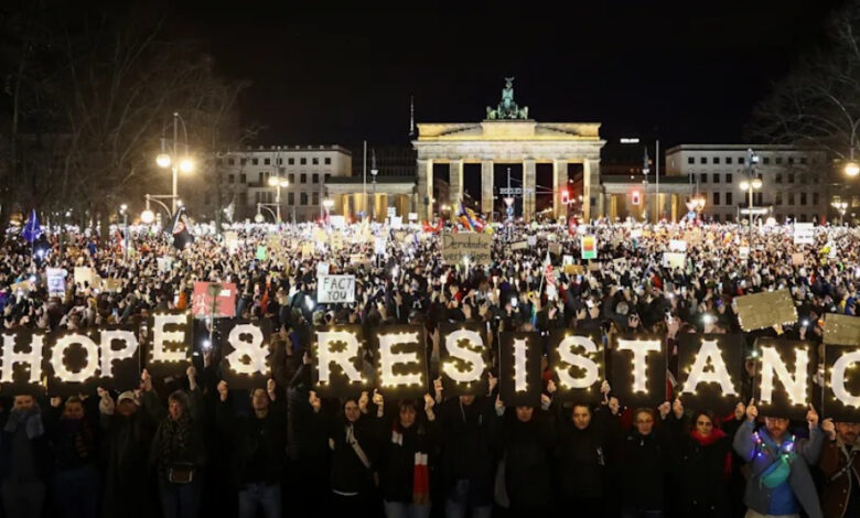 Polise.az xəbər verir ki, “Sağa qarşı” devizi altında keçirilən mitinqlərin ən izdihamlısı Almaniya paytaxtında təşkil olunub. Brandenburq qapılarının ətrafında keçirilən mitinqə 100 minədək nümayişçi qatılıb. İştirakçılar sağ ekstremistlərə və Almaniya üçün Alternativ Partiyasına (AfD) sərt etirazlarını səsləndiriblər.