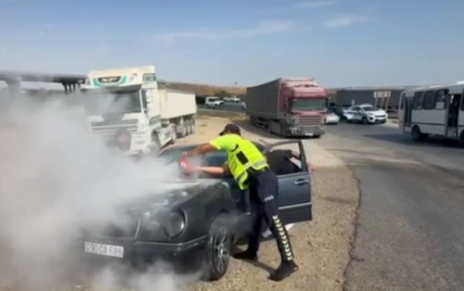 Avtomobildə başlayan yanğını polis əməkdaşları söndürüblər VİDEO