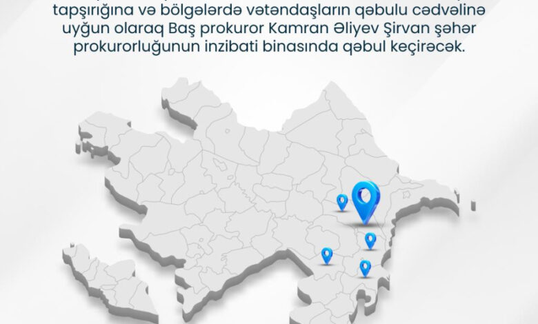 Prezident İlham Əliyevin tapşırığına və bölgələrdə vətəndaşların qəbulu cədvəlinə uyğun olaraq Baş prokuror Kamran Əliyev yanvarın 16-da, saat 10:00-da Şirvan Şəhər Prokurorluğunun inzibati binasında Şirvan şəhər, Hacıqabul, Salyan, Neftçala və Biləsuvar rayon sakinlərinin qəbulunu keçirəcək.