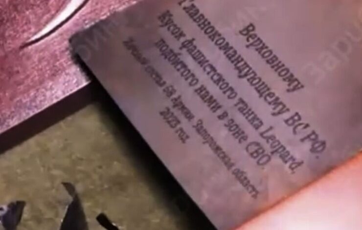 “Rusiya Silahlı Qüvvələrinin Ali Baş Komandanına. Şimal Hərbi Dairəsində məhv etdiyimiz “Leopard” tankının bir parçası. 58-ci Ordunun şəxsi heyəti. Zaporojye vilayəti, 2023″.